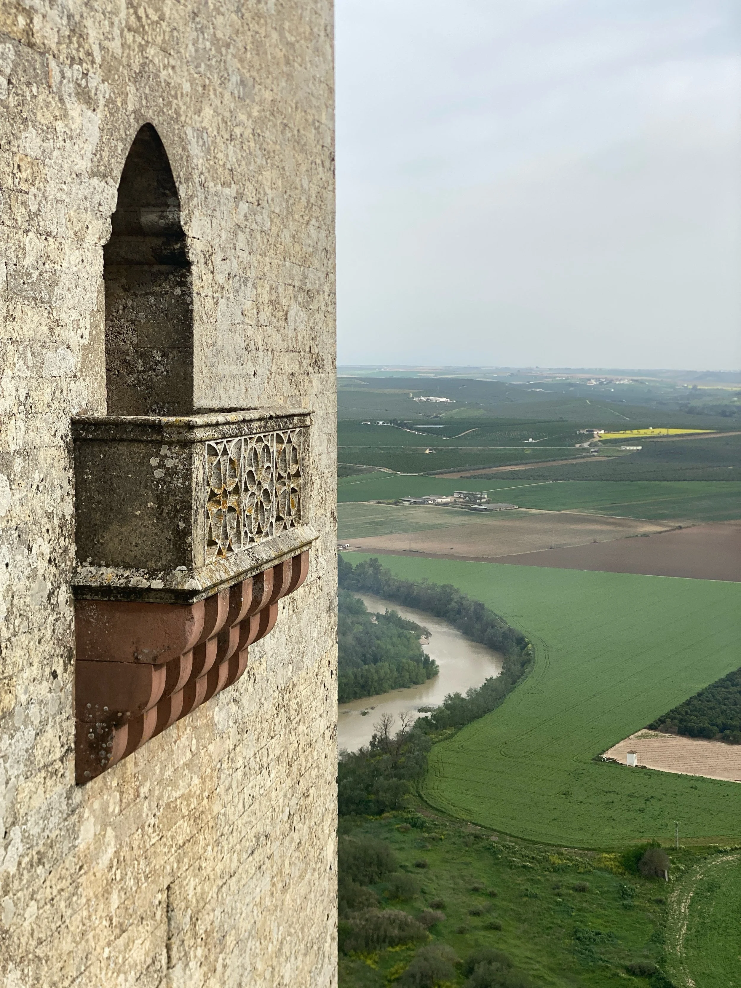 Standing on the famous balcony of the Castle of Almodóvar del Río, precariously perched high above the Guadalquivir river and its fertile plain, I am struck by the sheer immensity of the landscape. The horizon, shrouded in an early spring heat haze, seems impossibly distant, merging into the seemingly endless net of fields before me. The air carries a faint shimmer, hinting at the summer heat yet to come.