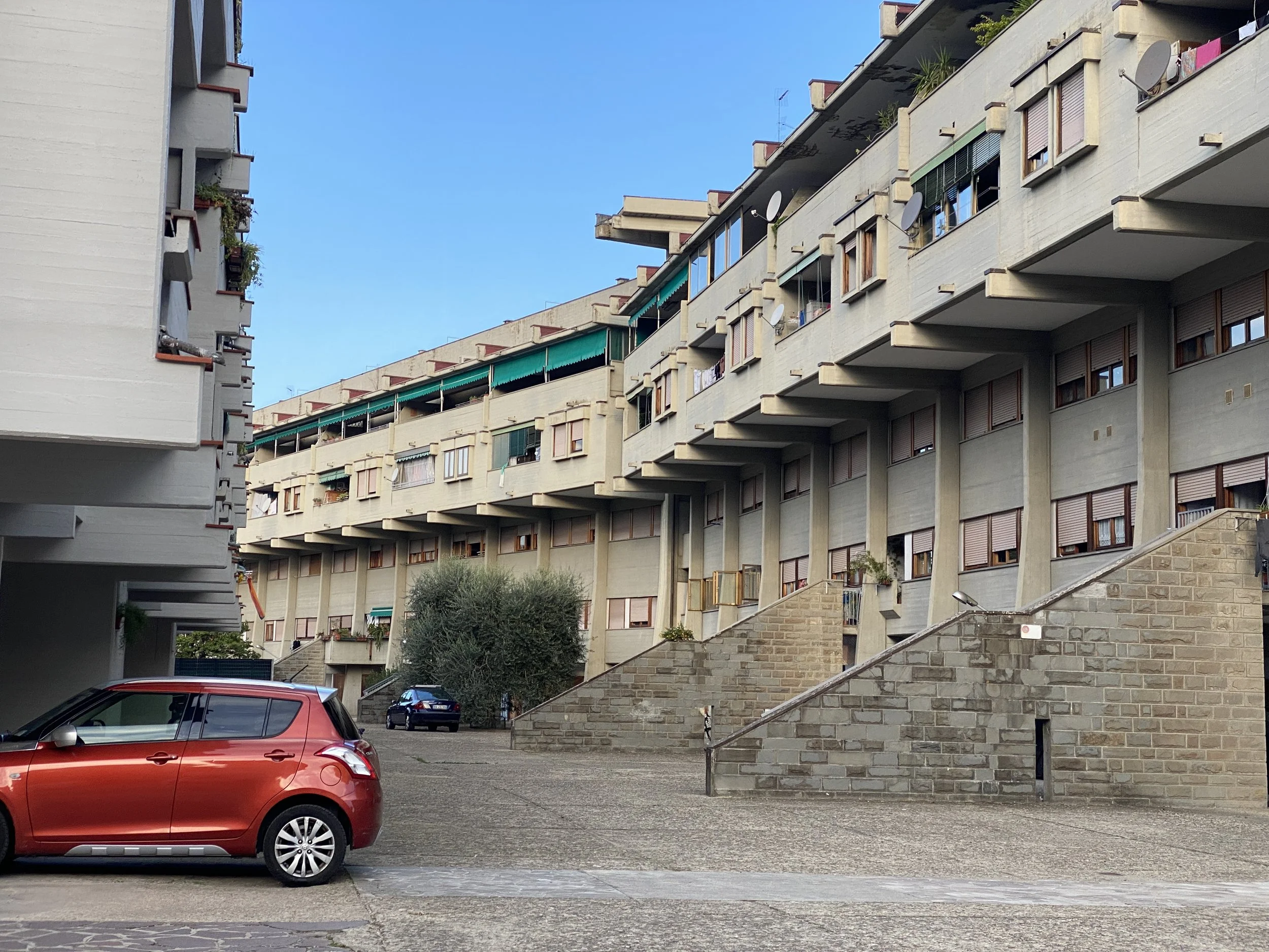 Brutalist architecture on the way out of Florence in Sorgane. Where the buildings seem to use concrete to join different bits of them together as a child might do when playing with notched wooden planks.
